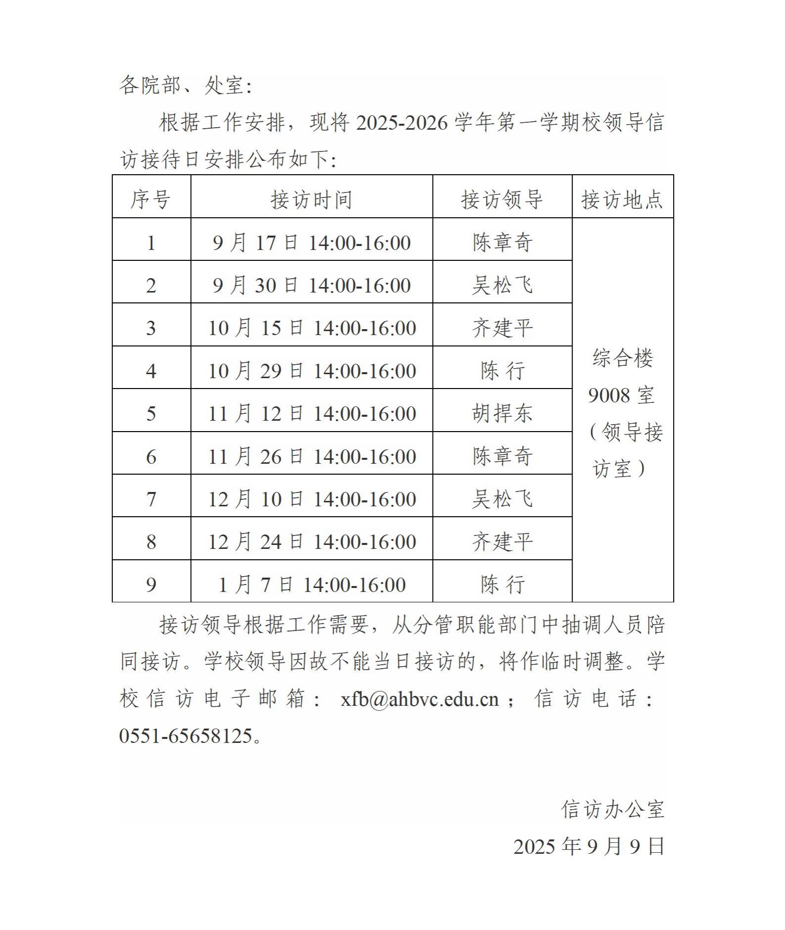 关于公布2025-2026学年第一学期校领导信访接访日有关安排的通知