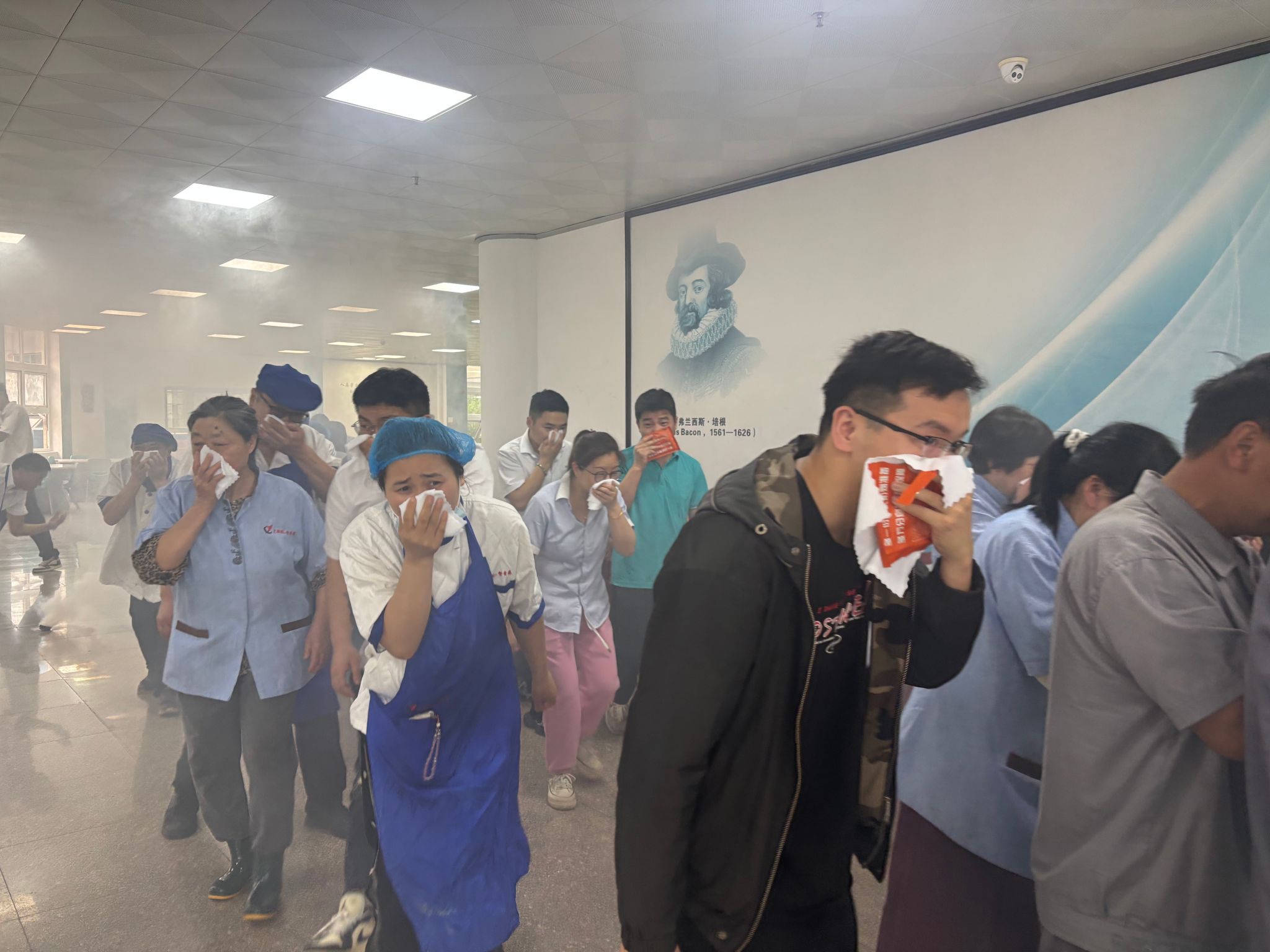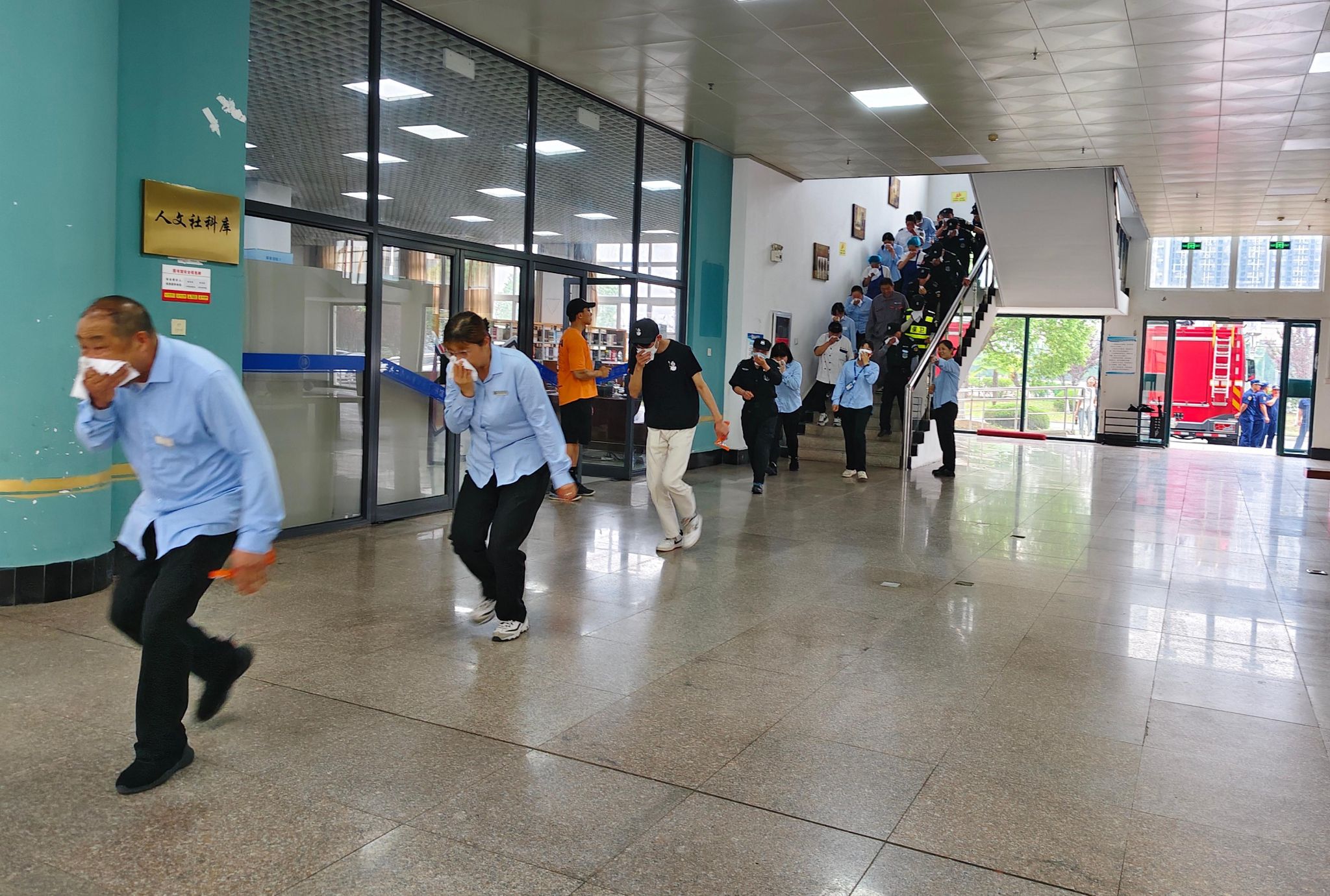 培训结束后,疏散逃生应急演练正式拉开帷幕。本次演练模拟场景设定为图书馆二楼突发火情,迅速释放烟雾,营造出突发火情的逼真氛围。随着“火灾警报”拉响,现场立即启动应急疏散预案。在消防安全员的引导下,师生员工用湿毛巾捂住口鼻,沿楼梯迅速、有序地撤离至图书馆外的安全集合点。整个疏散过程紧张有序、反应迅速、通道畅通、组织严密,所有参与人员均在预定时间内安全撤离完毕,达到了预期的演练效果。