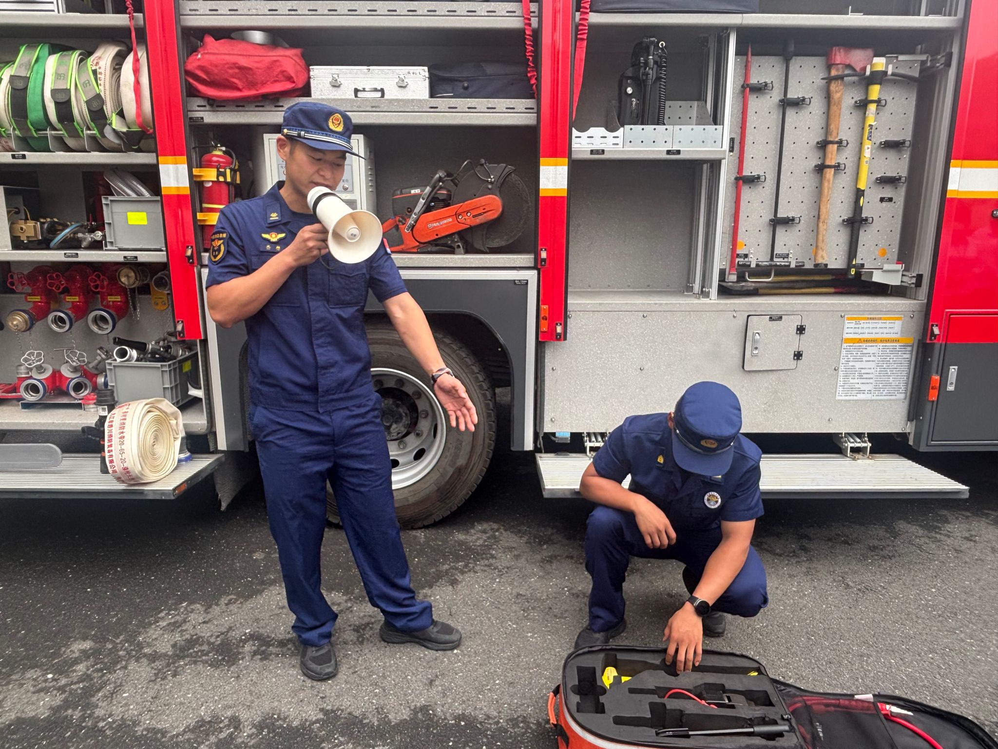 活动现场气氛热烈,消防队员带领大家参观消防车,集中展出了无齿锯、消防水带、多功能担架、灭火救援防护服等常见消防装备。消防队员逐一介绍装备的功能、适用场景及操作规程,师生员工通过近距离接触、实际操作,对消防装备的认知得到了进一步加强。