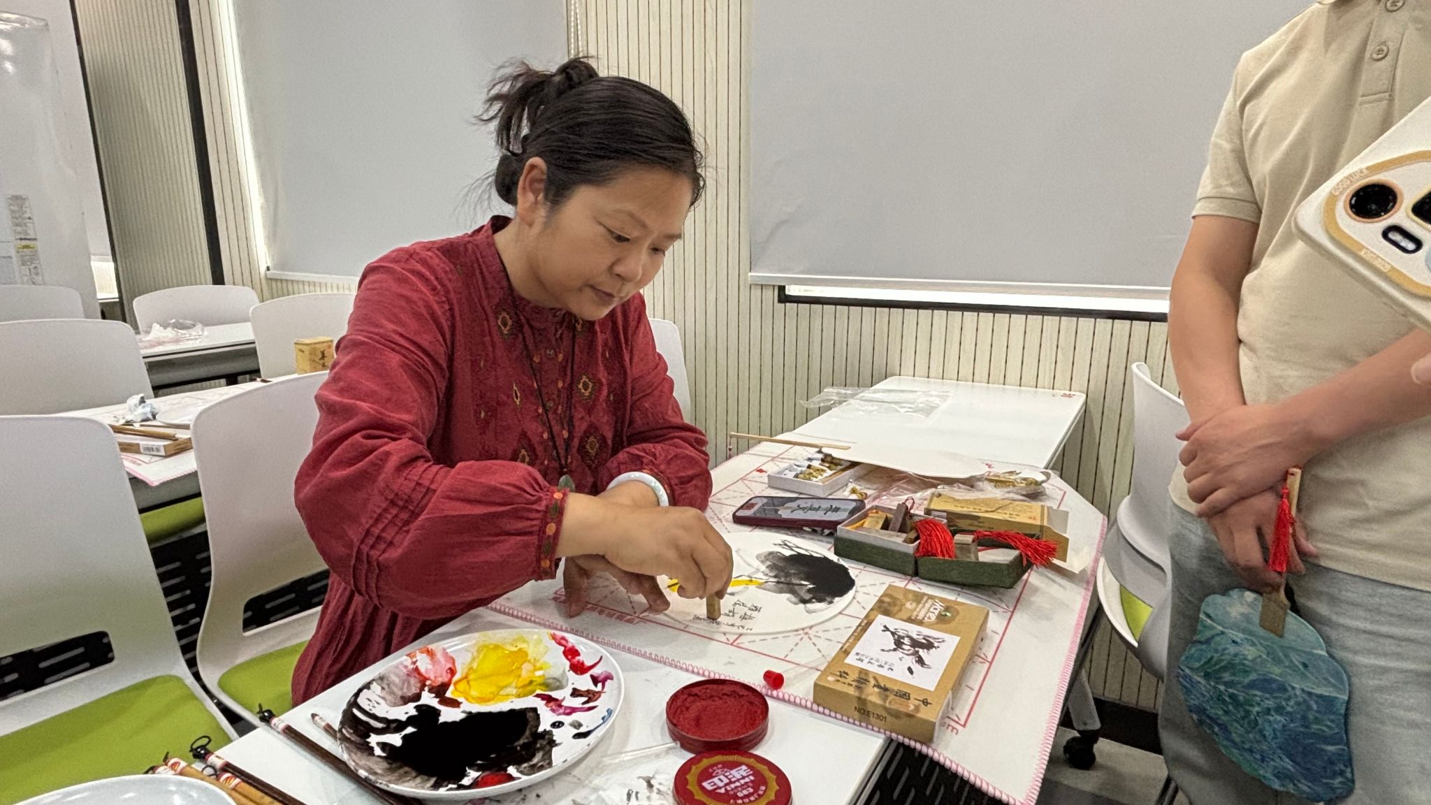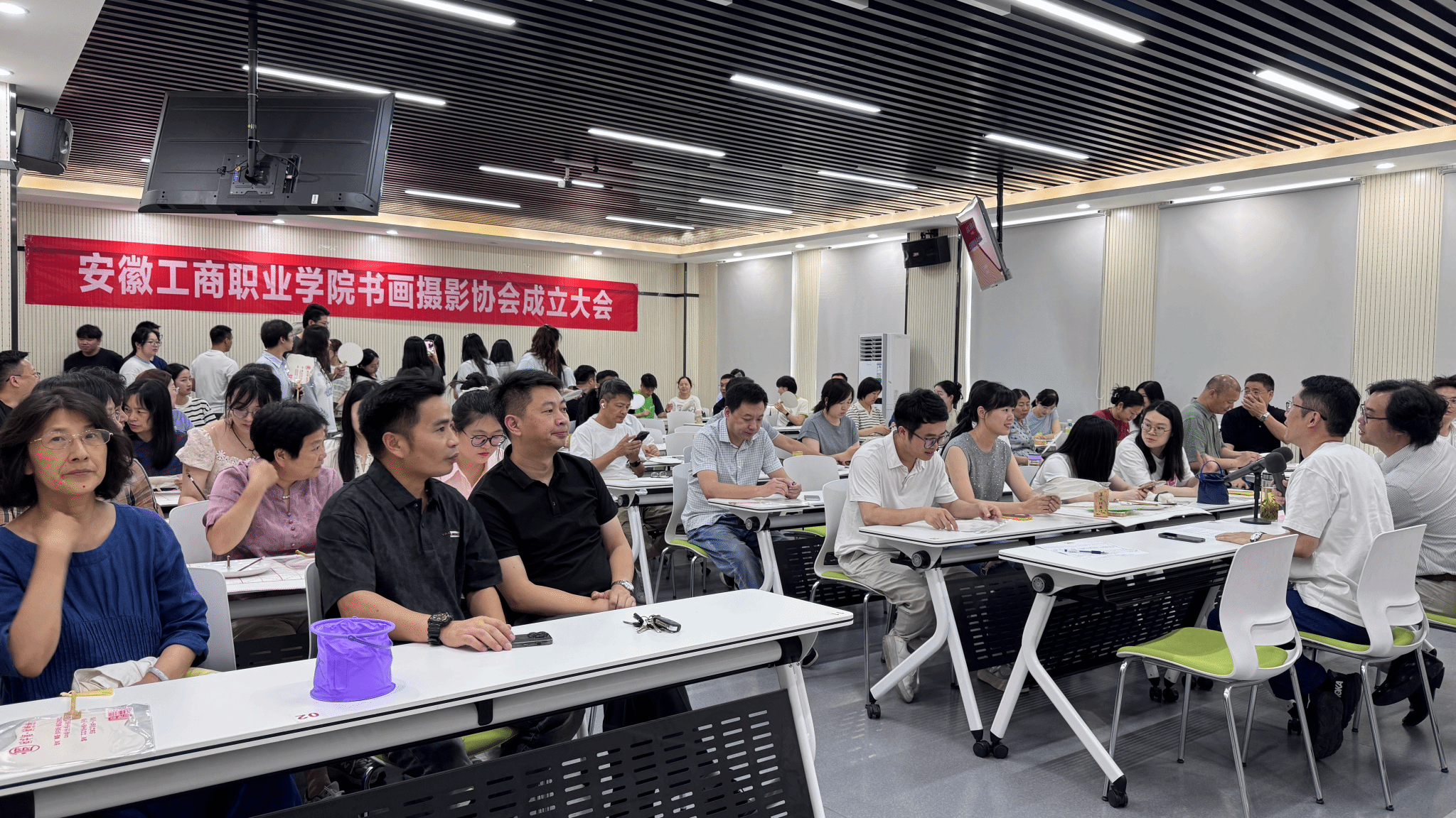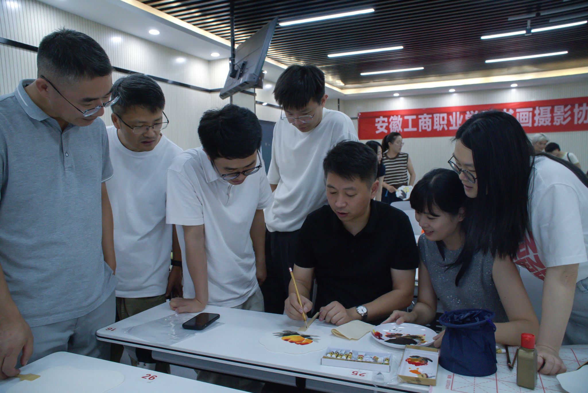 教职工书画摄影协会以“光影筑梦 教苑撷英”为主题的活动现场,瞿晨、梁秀丽、范韬、何玉三位指导教师分别就国画用笔用色技巧、人像摄影构图做了教学,会员们利用手中画笔、摄影器材亲手实操,描绘、拍摄出一幅幅生动画面。