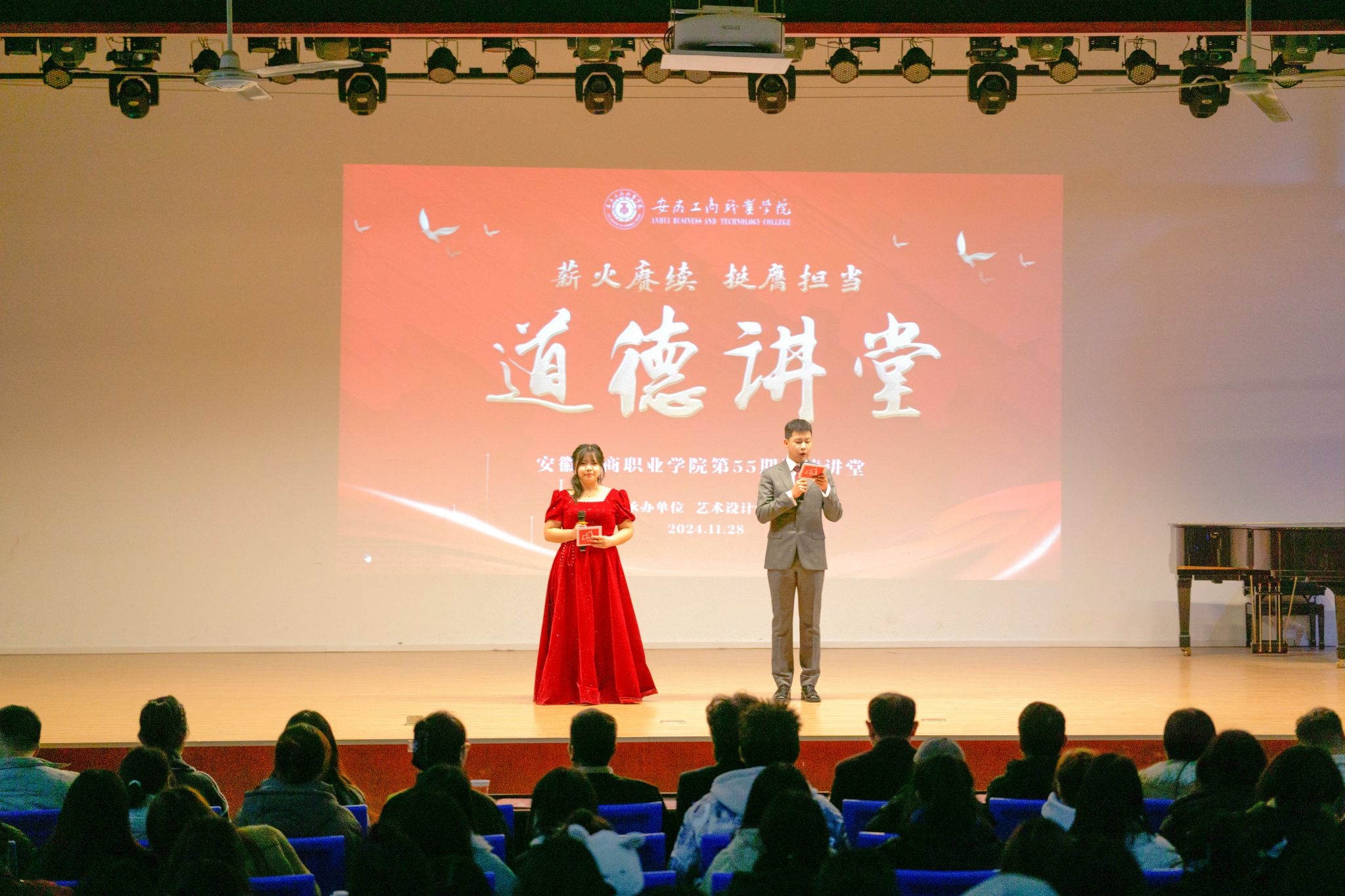 为了深入学习贯彻党的二十大、二十届三中全会精神,深入贯彻落实习近平总书记考察安徽重要讲话精神。11月28日晚,由必赢线路检测3003党委宣传统战部主办,艺术设计学院承办的第五十五期道德讲堂《薪火相传 挺膺担当》在庐阳校区时间剧场隆重举行。校党委委员、副院长胡捍东,党委委员、党委宣传统战部部长、艺术设计学院党总支书记孔成,艺术设计学院党总支副书记张乐,副院长邱志斌以及全体辅导员和500余名学生参加了活动。