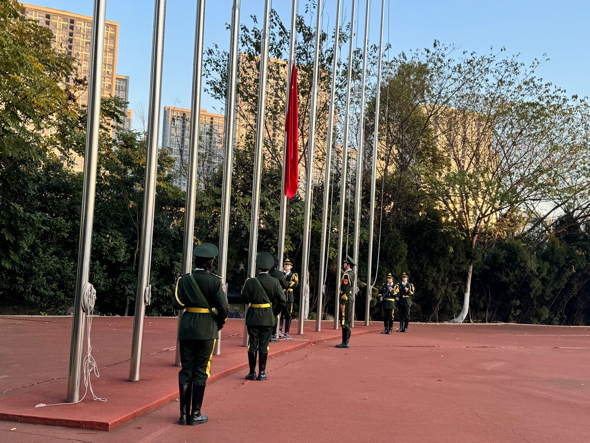 清晨7时20分,国旗护卫队的成员们踏着整齐的步伐,护送五星红旗缓缓走向升旗台,他们的身影在朝阳的映照下显得尤为英姿勃发。随后,《义勇军进行曲》响起,全体师生肃立,面向国旗致礼,并齐声高唱国歌。在晨光中飘扬的五星红旗,激发了大家炽热的爱国情感。