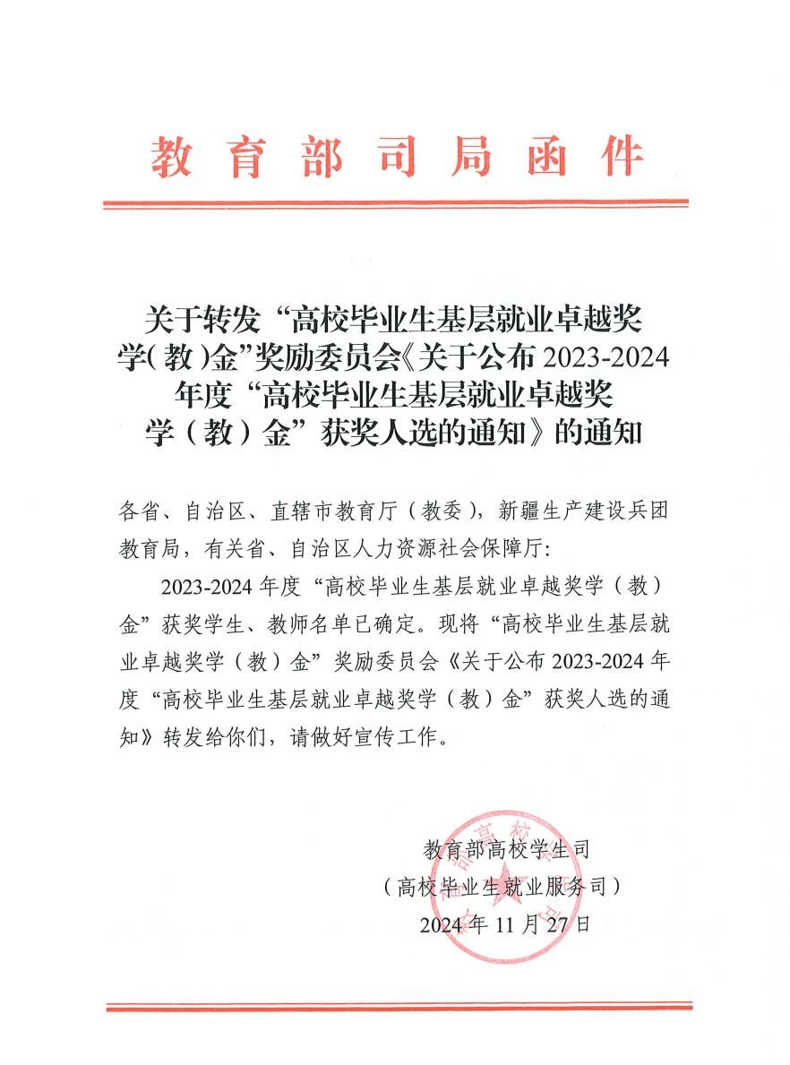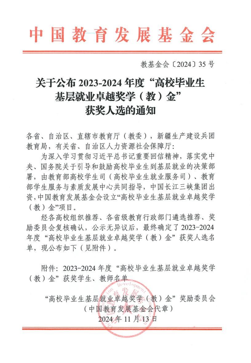 经各高校组织推荐、各省级教育行政部门遴选推荐、奖励委员会复核确认,公示无异议后,最终确定了2023-2024年度“高校毕业生基层就业卓越奖学(教)金”获奖人选名单。