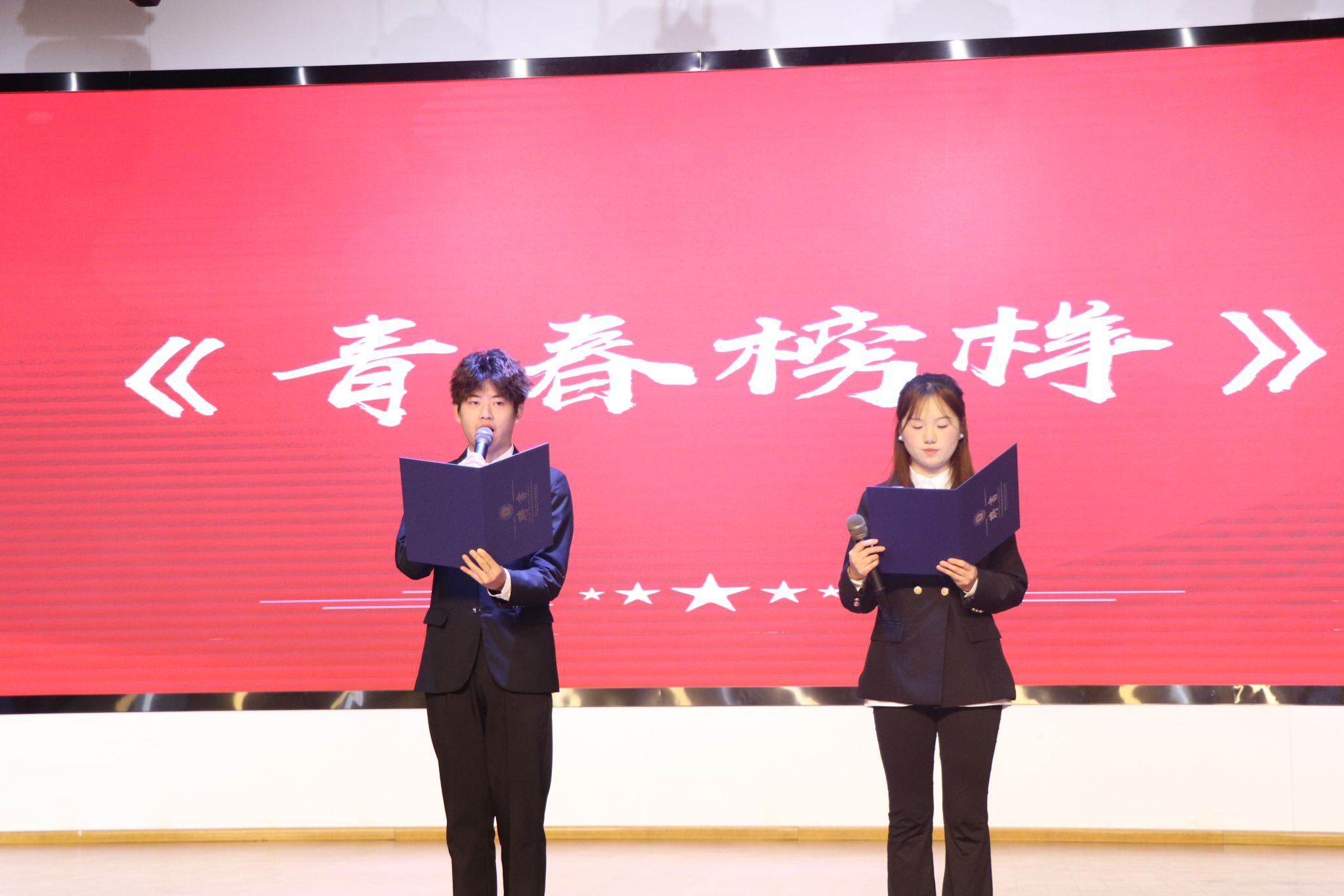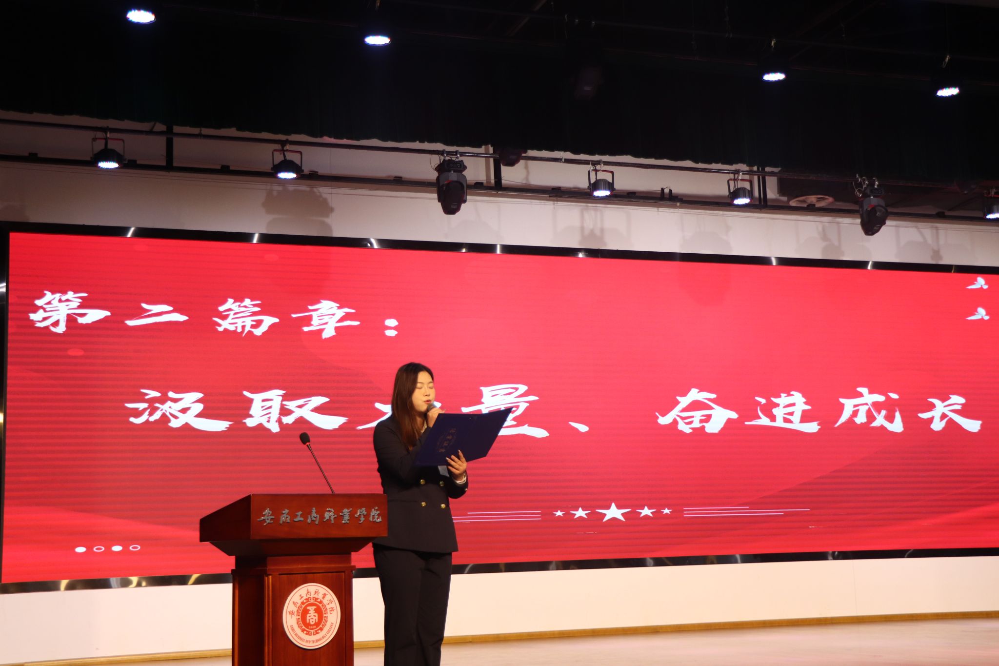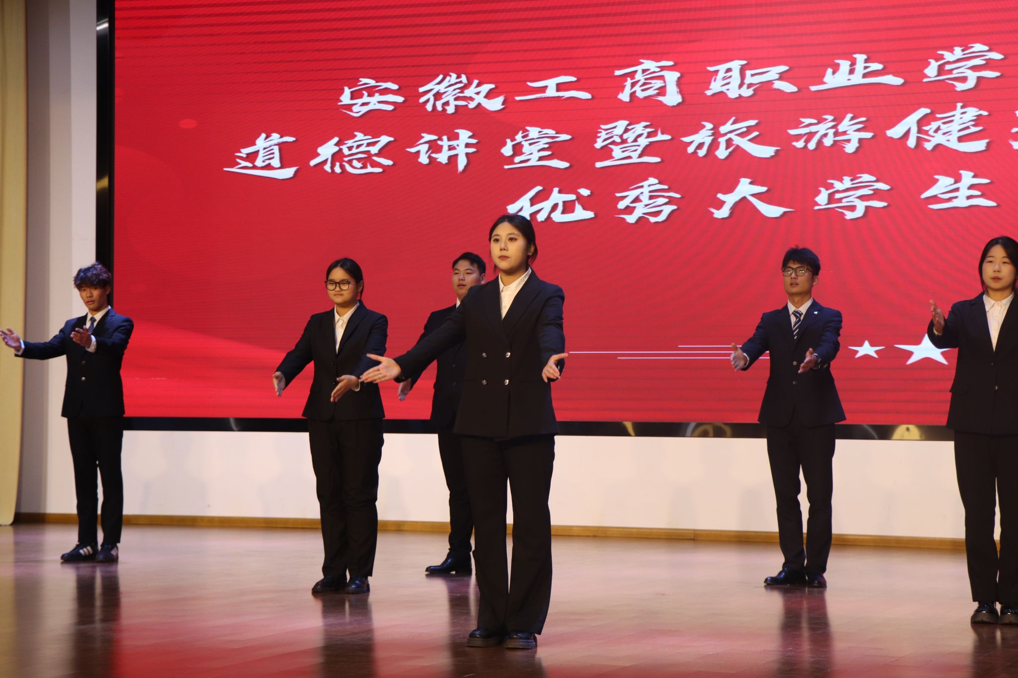 活动共分为三个篇章,第一篇章是学习榜样、青春引航。首先播放了活动宣传视频《最好的榜样》,视频中,从图书馆到实训室,从课桌旁到绿茵场,同学们用各自的方式勤奋学习,努力奋斗,让现场师生深受震撼。随后,旅游健康学院院长傅绪明为本次活动致词,他表示获得优秀荣誉的同学们勇担时代使命,在勤学中探索、在实践中 磨砺、在挑战中成长,彰显了新时代大学生踔厉奋发的青春风采和奋斗精神,他们是我们身边的榜样,也是我们前行的力量。他希望同学们要涵育理想,志存高远,肩负时代使命;要锤炼本领,脚踏实地,争做时代新人;勇毅担当,躬身实践,扎根时代沃土。他勉励广大同学要坚定不移听党话、跟党走,怀抱梦想又脚踏实地,敢想敢为又善作善成,立志做有理想、敢担当、能吃苦、肯奋斗的新时代好青年,让青春在全面建设社会主义现代化国家的火热实践中绽放绚丽之花。