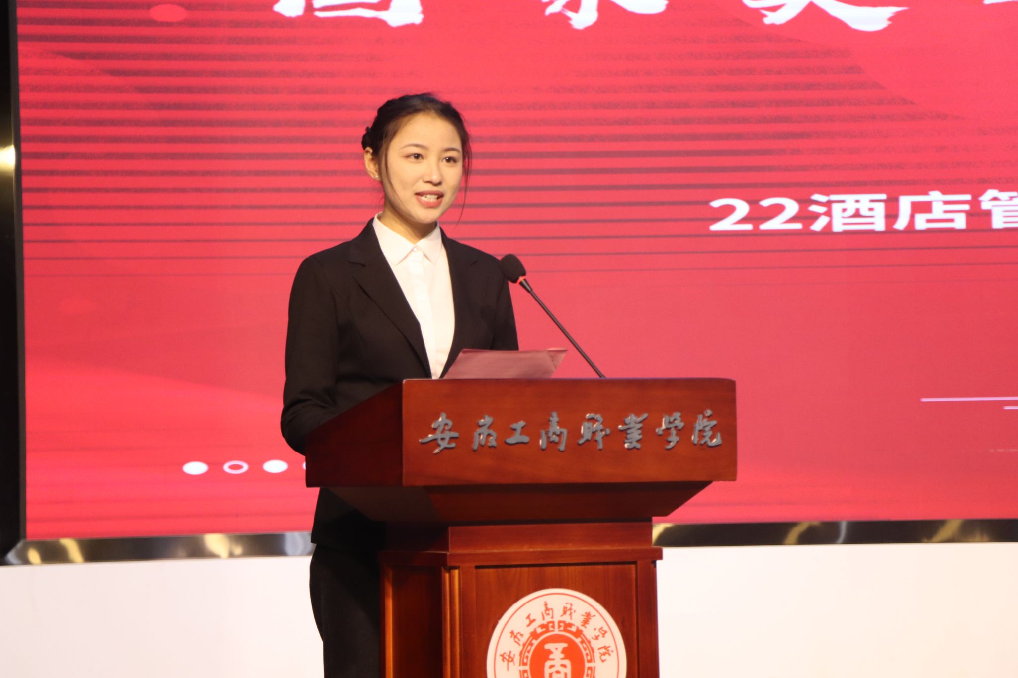 随后,22酒店管理与数字化运营3班戎尤兰同学作为2024年度国家奖学金获奖代表发言,她回顾了了自己入学以来的点点滴滴,分享了如何从从最初的懵懂无知到如今自信自强,一路有欢声与笑语,有心酸与泪水。她鼓励同学们努力就有回报,愿我们的青春之梦在实现中华民族伟大复兴的征程中绽放光彩!22烹饪工艺与营养6班白家宝同学作为2024年度世界技能大赛获奖代表发言,他回顾了自己参加技能大赛烹饪赛项和导游服务赛项的经历,分享了自己的心得与体会,他希望同学们专研专业知识,提高专业技能,朝着大国工匠、能工巧匠的目标而努力奋斗。23旅游管理3班吴子墨同学作为学校三好学生和优秀学生干部代表发言,她表示,大学生活是充满挑战和机遇的,在这里,我们不仅学到了丰富的专业知识,更在思想、能力和综合素质上得到了全方位的提升。每一次的课堂讨论、每一次的社团活动、每一次的志愿服务,都是我们成长的宝贵经历,让我们在实践中不断磨砺自己,成为更加优秀的人。