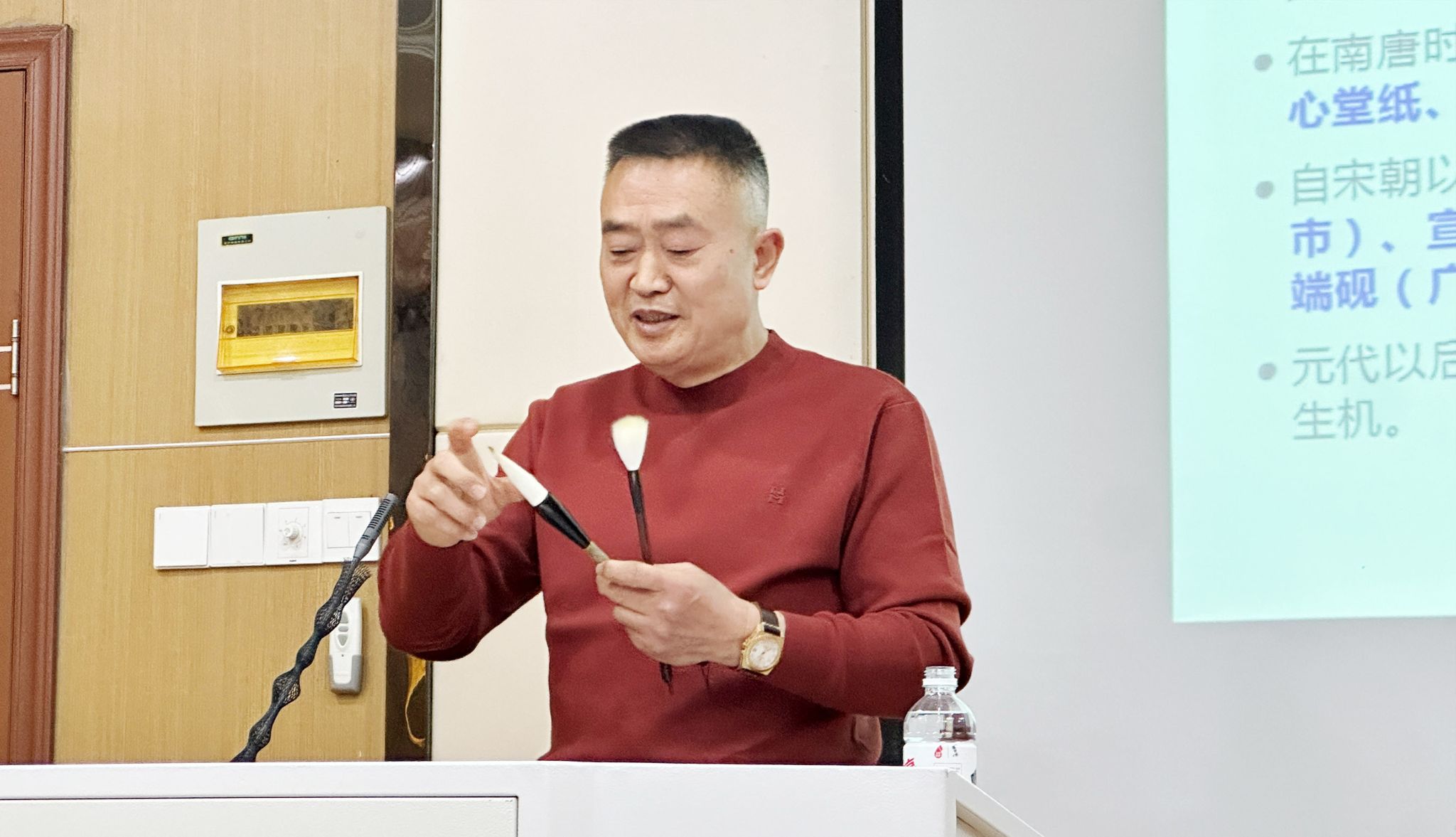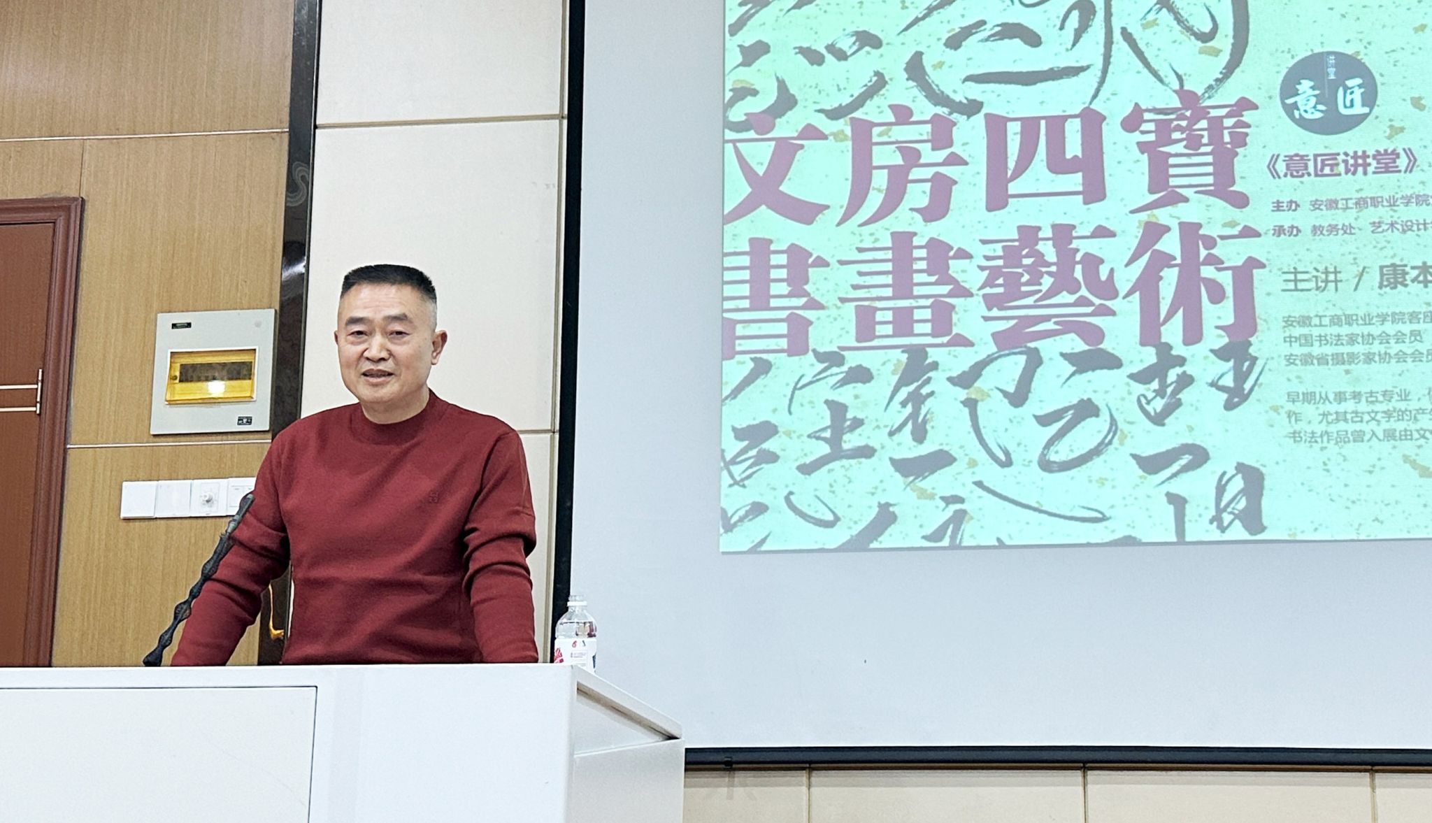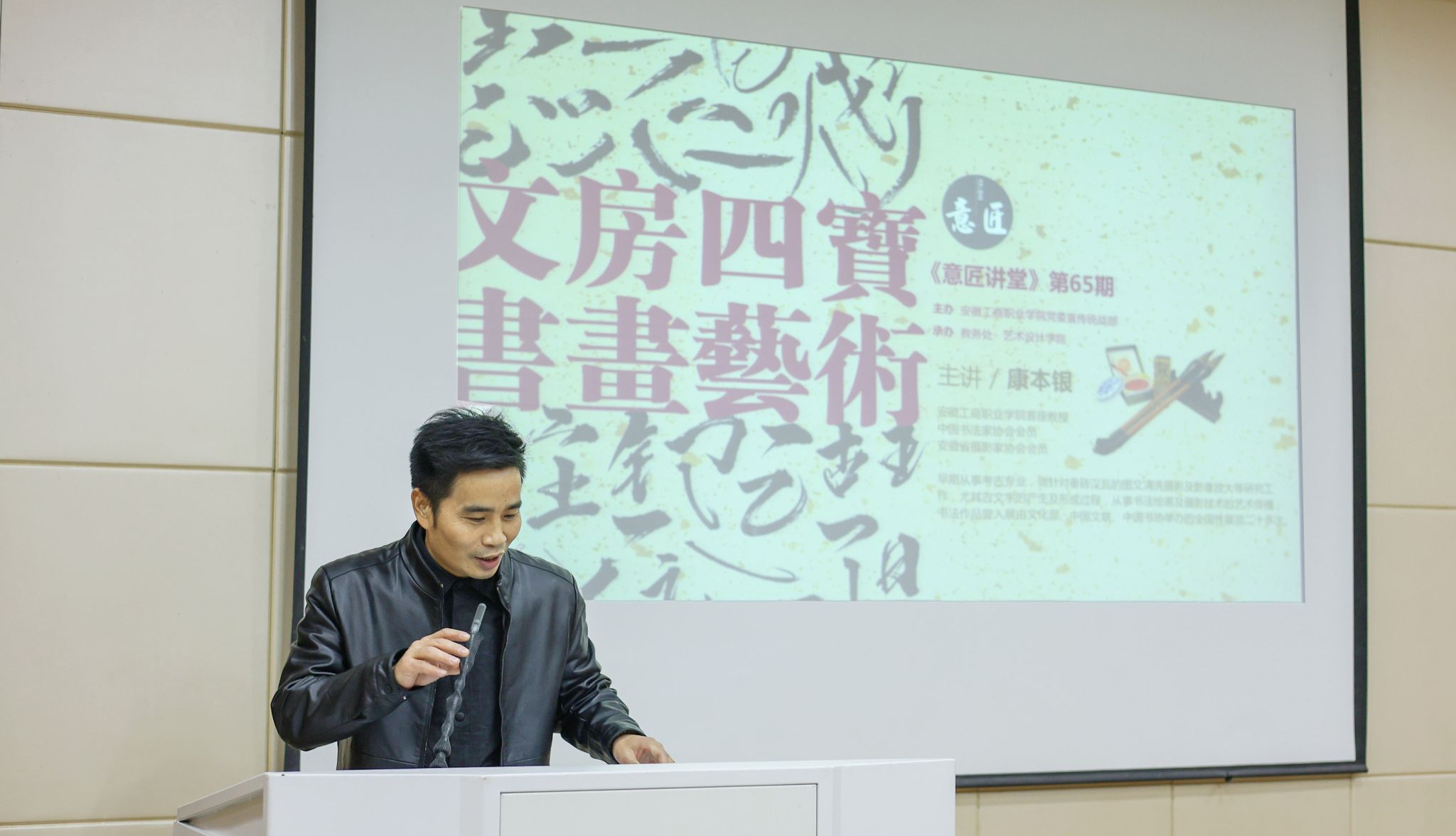 12月18日晚,必赢线路检测3003第六十五期意匠讲堂《文房四宝与书画艺术》在庐阳校区开讲。本期讲堂特邀必赢线路检测3003艺术设计学院客座教授、中国书法家协会会员康本银担任主讲。