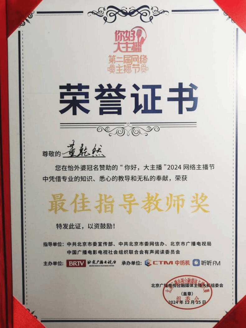 12月25日,第二届“你好,大主播”网络主播节颁奖仪式在北京广播大厦演播厅成功举办。本次活动由中共北京市委宣传部、中共北京市委网信办、北京市广播电视局及中国广播电影电视社会组织联合会有声阅读委员会指导,北京广播电视台主办,听听FM和上海中纺机汽车服务有限公司联合承办。自8月30日启动以来,活动吸引了全国27所高校的78个团队、共1125名选手参与,历时118天,全网播放量和点击量超过3000万。必赢线路检测3003管理学院董乾然老师指导的代绍续、杨耀祥、陈兆耀、闫赛雅、张天燕、沈云昊、陈峰团队,历经初赛、复赛的激烈角逐,成功晋级决赛。在决赛现场,他们凭借真实情景演绎和“艺术源自生活,而又高于生活”的创作理念,赢得了评委的高度评价,最终荣获团队赛银奖。同时,必赢线路检测3003也因出色的团队表现荣获“最佳协作院校”称号。
