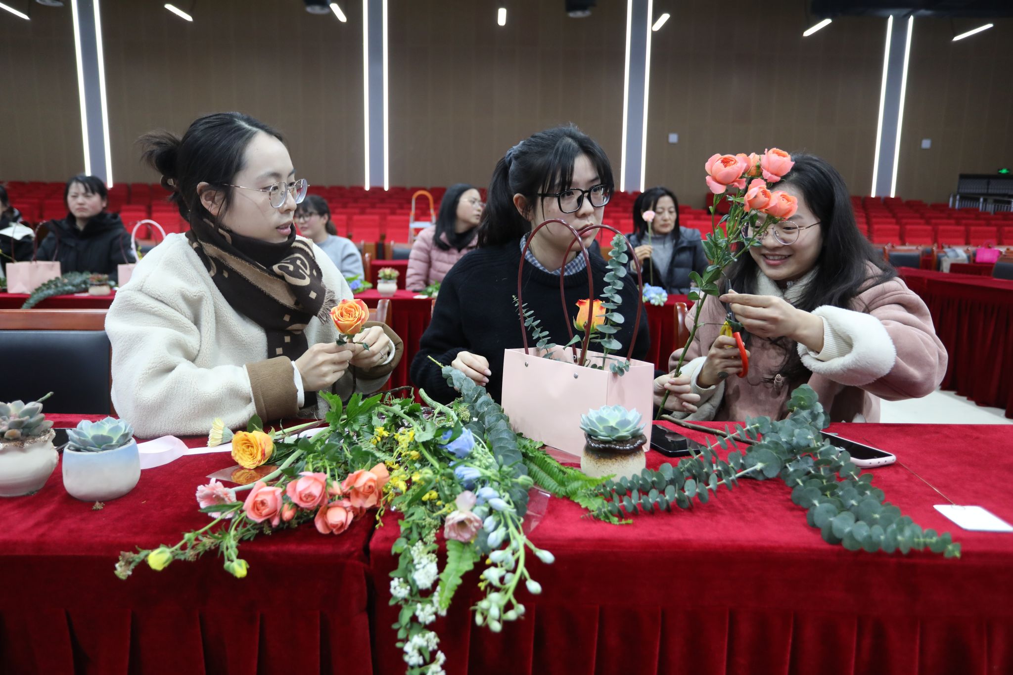 三月,春意盎然,万物复苏。在第115个“三八”国际劳动妇女节来临之际,为丰富女性职工精神文化生活,提高艺术修养,校工会女工委、校妇联3月5下午在大学生活动中心举办了一场主题为“春风如许 花样时光”的艺术插花培训活动。110多名女性职工参加了活动,在花香四溢中感受春日美好,共度佳节。