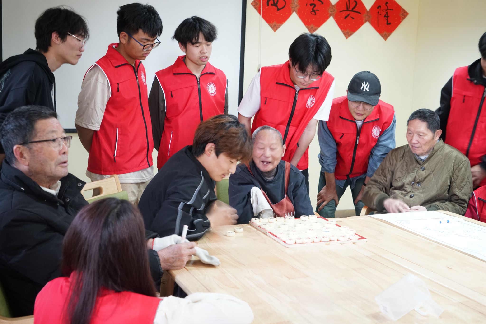 文艺表演结束后,志愿者们迅速分散到各个小组,投入丰富多彩的互动活动中。在象棋小组,一场跨越年龄的象棋对弈悄然展开。棋盘上,双方你来我往,棋逢对手,老人们凭借丰富的经验,志愿者们则凭借灵活的思维,每一次落子都充满了智慧与乐趣。棋盘上攻守交锋,棋盘外温情流淌,老人们在对弈中分享着自己的棋艺心得,志愿者们则虚心请教,老少之间的交流在棋盘上悄然升温。