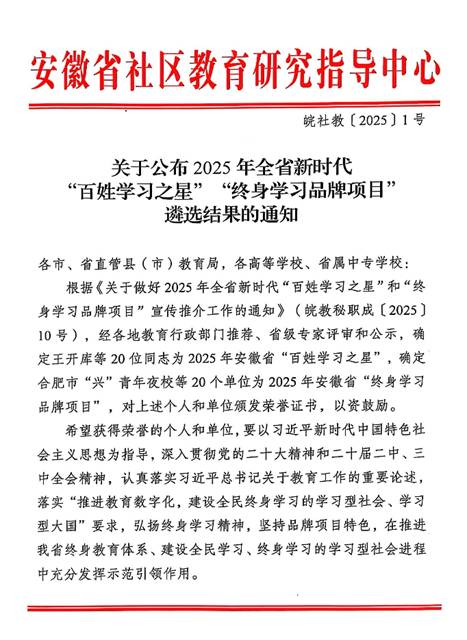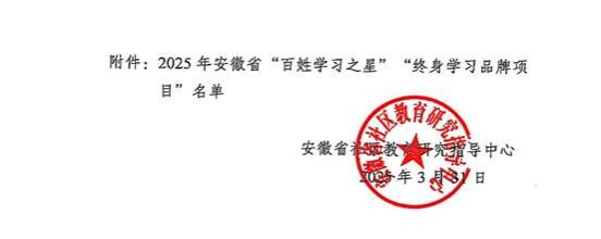 近日,安徽省社区教育研究指导中心公布2025年全省新时代“百姓学习之星”“终身学习品牌项目”遴选结果。必赢线路检测3003申报的“知行学堂——赋能乡村振兴与全民学习的创新实践”项目获评2025年安徽省“终身学习品牌项目”。