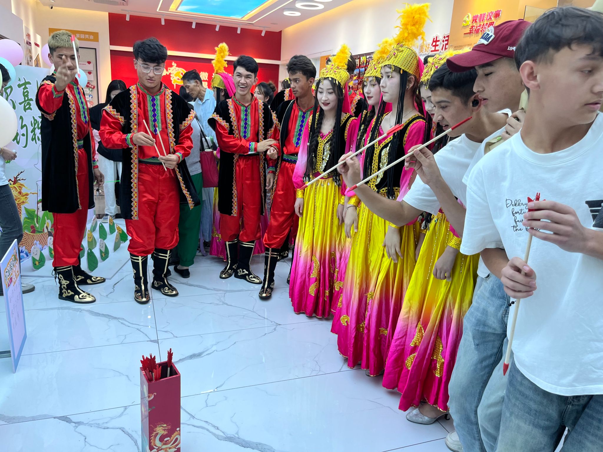 本次主题市集活动共设置了五个特色打卡区域,参与者完成相应任务即可获得精美小礼品。在包粽子市集区,社区内擅长包粽子的居民现场展示技艺,同学们与居民围坐在一起,动手体验包粽子的乐趣。包好的部分粽子由志愿者送至社区独居老人和困难家庭手中,传递温暖与关爱。艾叶花束DIY区,志愿者介绍艾草、菖蒲的象征意义,指导制作艾叶花束,同学们将自己制作的花束带回寝室,驱邪祈福。投壶游戏区和射五毒游戏区也吸引着同学的热烈参与。钓粽子游戏区,手持钓竿的同学们紧张又兴奋地挑战限时钓粽子的任务。弘扬传统,增强归属感,主题活动让少数民族同学们深入了解了中华传统节日——端午节的传统习俗,提升了民族凝聚力和认同感。