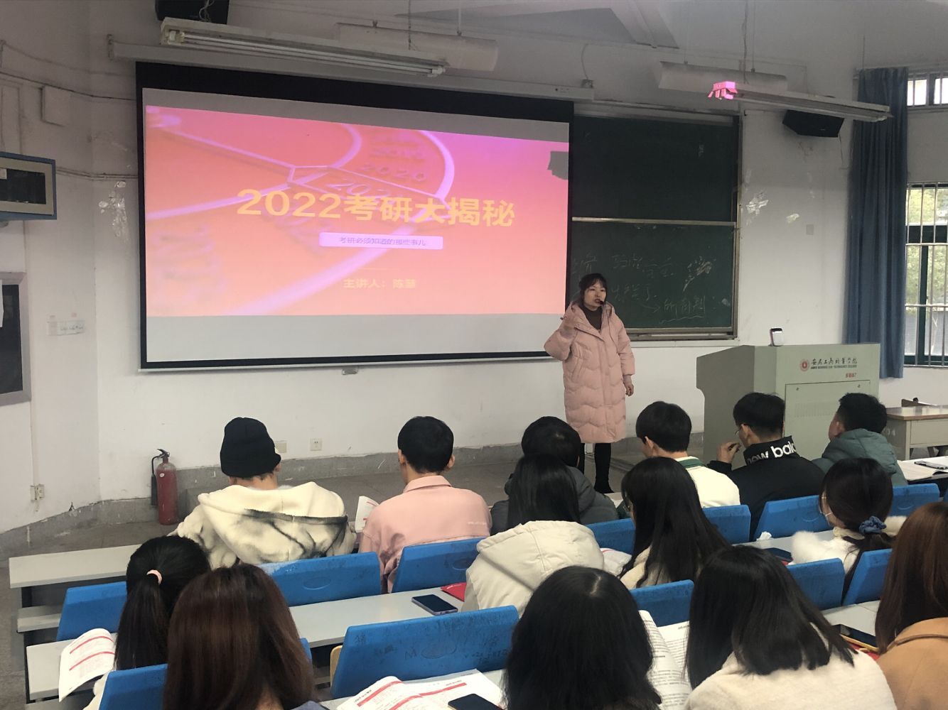 陈慧老师从考研形势分析、考研难度分析、考研常识分析、考研启动计划四个方面给学生带来了一场“考研大揭秘”。首先从经济形势、就业形势、留学形势、考公形势等分析上总结出考研是当前形势下较好的选择;紧接着用详细的数据、生动的案例对考研难度进行了深入的分析,让学生知晓考研并非想象中难度那么大;再者陈老师向在座学生普及了考研的相关常识,解答了学生关于学术硕士和专业硕士、全日制和非全日制、定向和非定向、一区和二区等问题的困惑;最后陈老师结合考研的重要时间节点为学生了制定了详细的考研启动计划,并对考研相关科目及择校择专业等问题进行了讲解。现场座无虚席,气氛热烈,学生们表现出了对考研的极大兴趣,纷纷表示受益颇多。讲座最后, 舒文存作总结发言,对广大备考学子提出了宝贵的建议和期望寄语,祝愿备考学生们一战成硕。