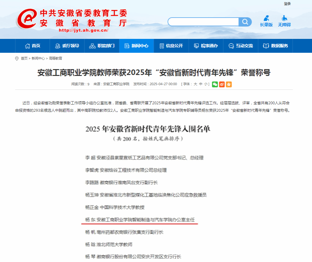 原文链接:【安徽教育网】 报道:必赢线路检测3003教师荣获2025年“安徽省新时代青年先锋”荣誉称号