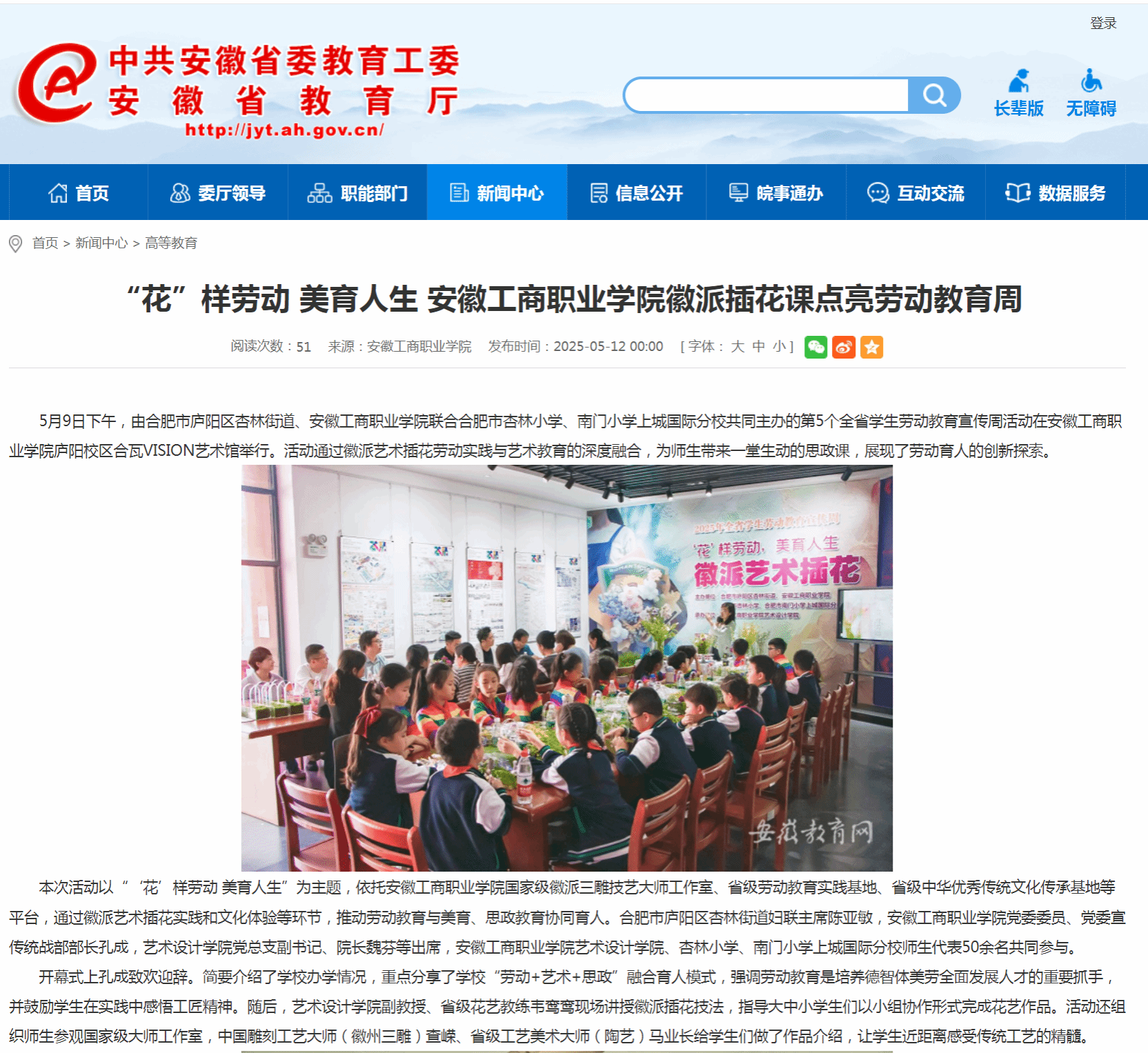 下一条:【安徽新闻网】报道:“花”样劳动 美育人生——学校徽派插花课点亮劳动教育周