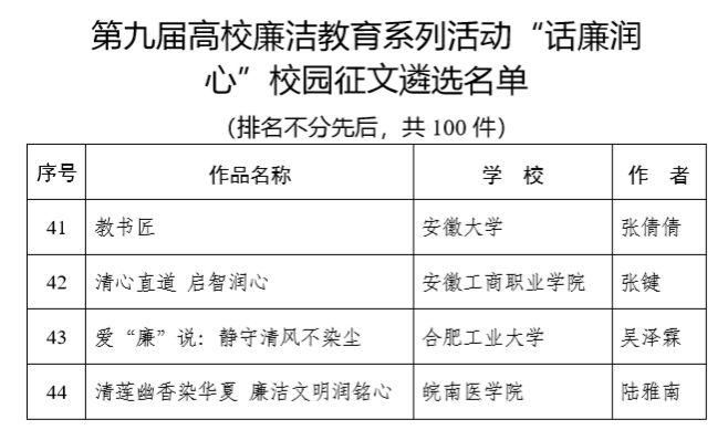 近日,教育部公布了第九届高校廉洁教育系列活动结果,安徽省共有15所本科、5所高职院校的作品入选各项百优遴选名单。必赢线路检测3003经济贸易学院副院长张键的作品成功入选“话廉润心”校园征文百优遴选名单。