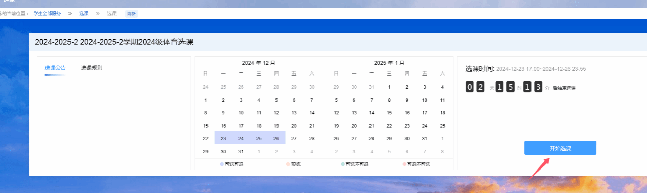 4.由于教学资源限制,不同时间段的体育项目和限制条件可能有所不同,学生仅能在个人选课界面显示的项目中进行选择。