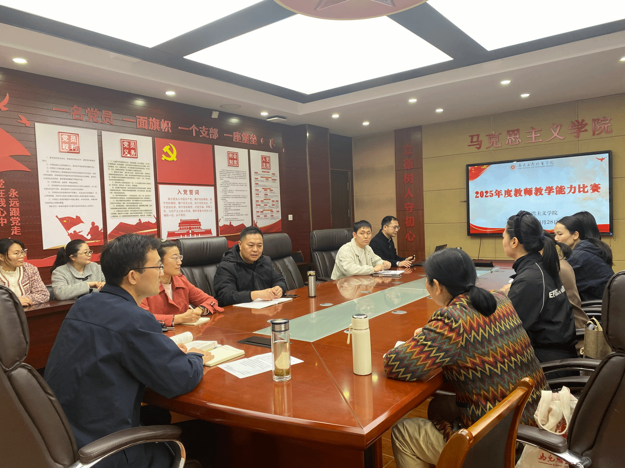为进一步深化思政教学改革,提升思政教师教育教学能力,建设一支政治素质过硬、业务能力精湛、育人功底扎实的思政课教师队伍。2025年3月28日,马克思主义学院在明德楼3号会议室成功举办了教师教学能力大赛。马院党总支书记、院长葛成飞和部分思政教师参会,马院副院长、思政课党支部书记蒋强军主持会议。