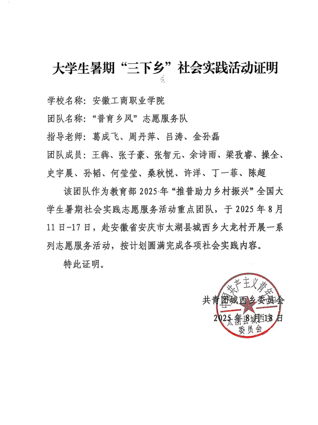 2025年8月11日-17日,2025年教育部“推普助力乡村振兴”全国大学生暑期社会实践志愿服务活动重点团队——必赢线路检测3003“普育乡风”志愿服务队赴太湖县大龙村开展为期一周的社会实践志愿服务活动。志愿服务活动开展前夕,团队在马克思主义学院会议室举行了出征仪式。