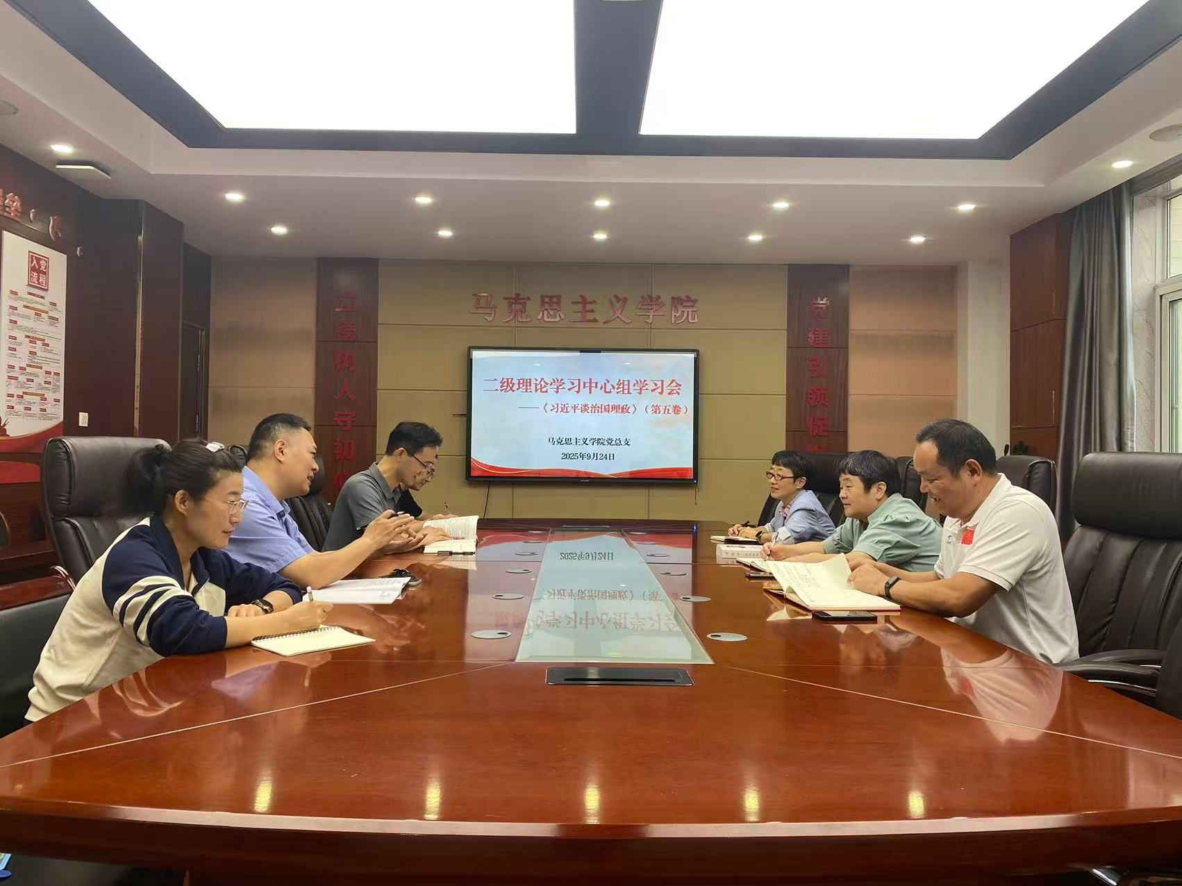 9月24日,马克思主义学院党总支召开二级理论学习中心组学习会,专题学习《习近平谈治国理政》第五卷部分内容,学习会结合常态化深入贯彻中央八项规定精神学习教育,以学铸魂强纪律、以学促行践初心,党总支全体成员参会。