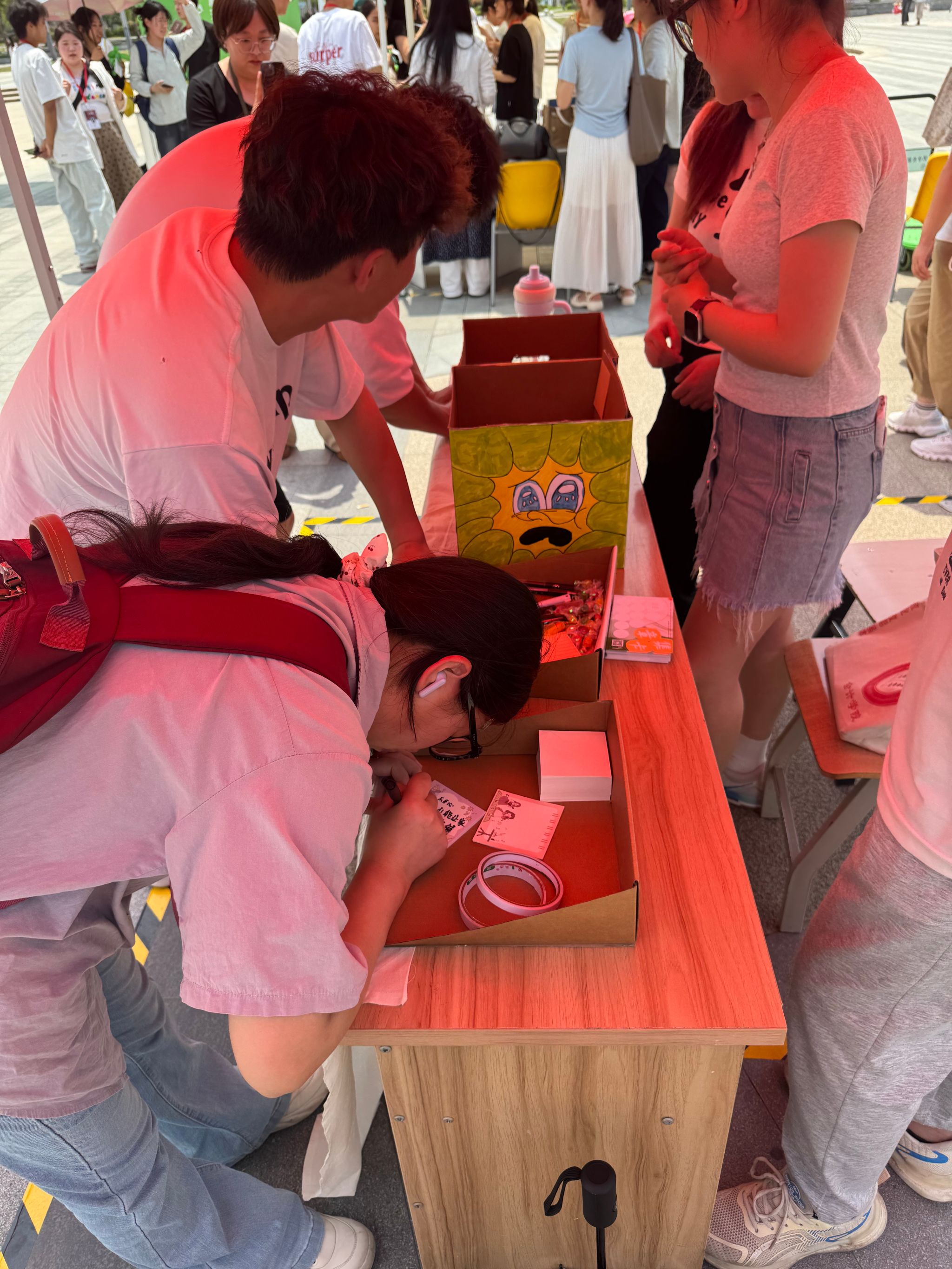 心理健康教育中心携手二级学院匠心打造了九大主题摊位、十款趣味心理游戏,将专业性与趣味性深度融合。心理健康教育中心推出“花式心理知识问答”普及常识,设计“丢掉包袱”挑战,让参与者把压力写进沙包,一掷卸负,直呼 “轻松”;校心理协会以“情绪盲盒”传递暖心语录,借“温情传递”收集陌生人祝福,点亮善意微光。各学院的特色活动同样精彩纷呈:管理学院发起“给明年的自己一封信”,承载学子对未来的憧憬;艺术设计学院开展“漆彩纷呈,扇染心色” 漆扇制作,以艺术疗愈释放情绪;智能制造与汽车学院组织“情绪气球互换”,用踩爆气球的仪式感完成情绪宣泄;会计学院的投壶飞镖、旅游健康学院的“心语心愿”漂流瓶、经济贸易学院的团扇 DIY与 STROOP测试等,也吸引众多同学踊跃参与。