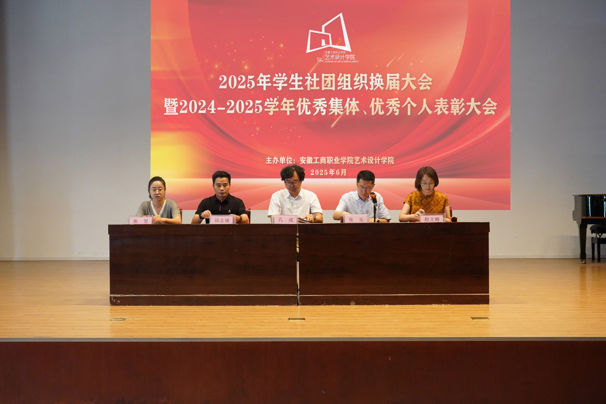 6月18日,艺术设计学院在庐阳校区时间剧场召开2025年学生社团组织换届暨表彰大会。校党委委员、党委宣传统战部部长、学院党总支书记孔成,党总支副书记张乐,副院长邱志斌,相关科室负责人,各班级辅导员及500余名学生参加会议。张乐主持会议。