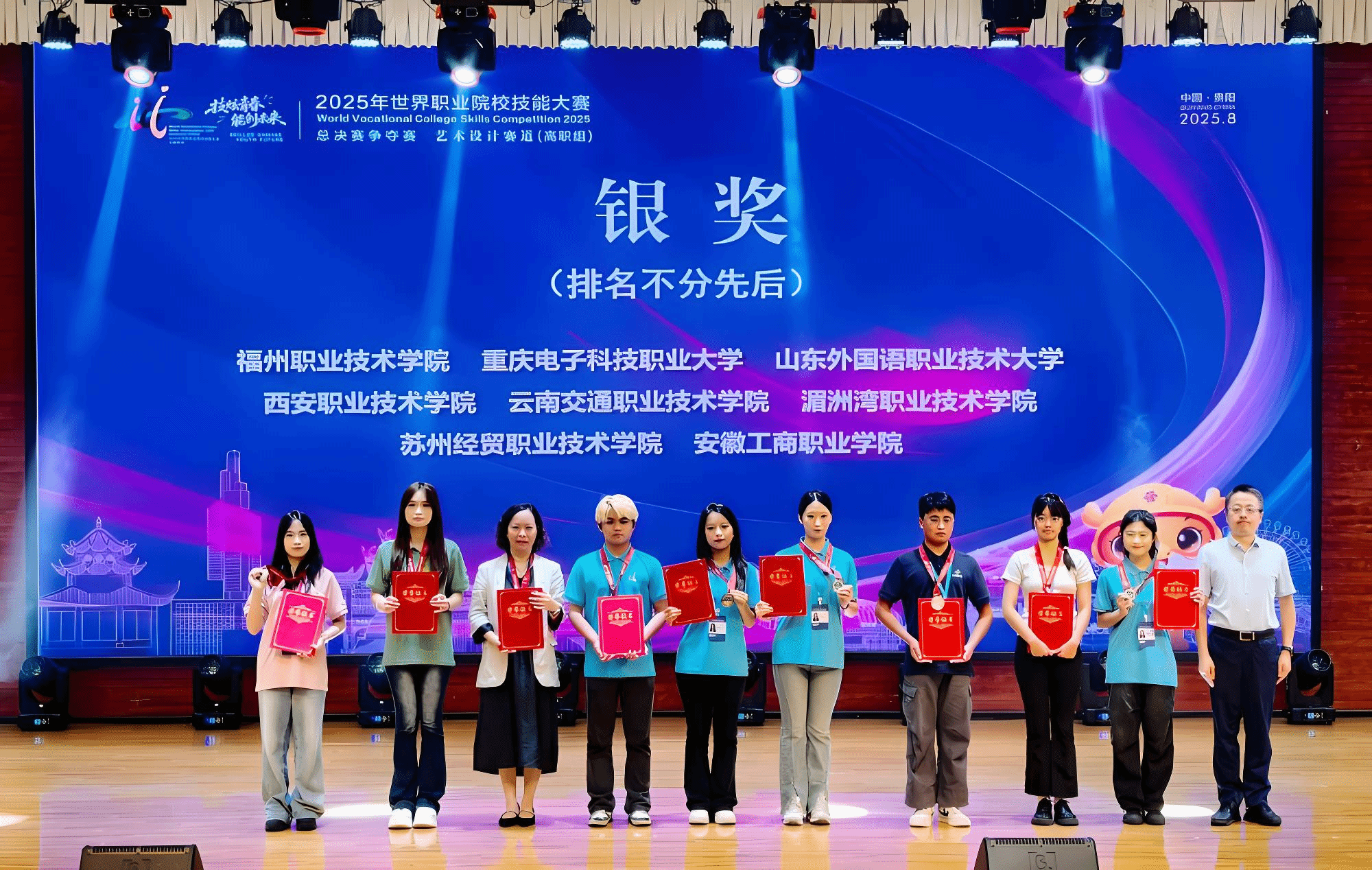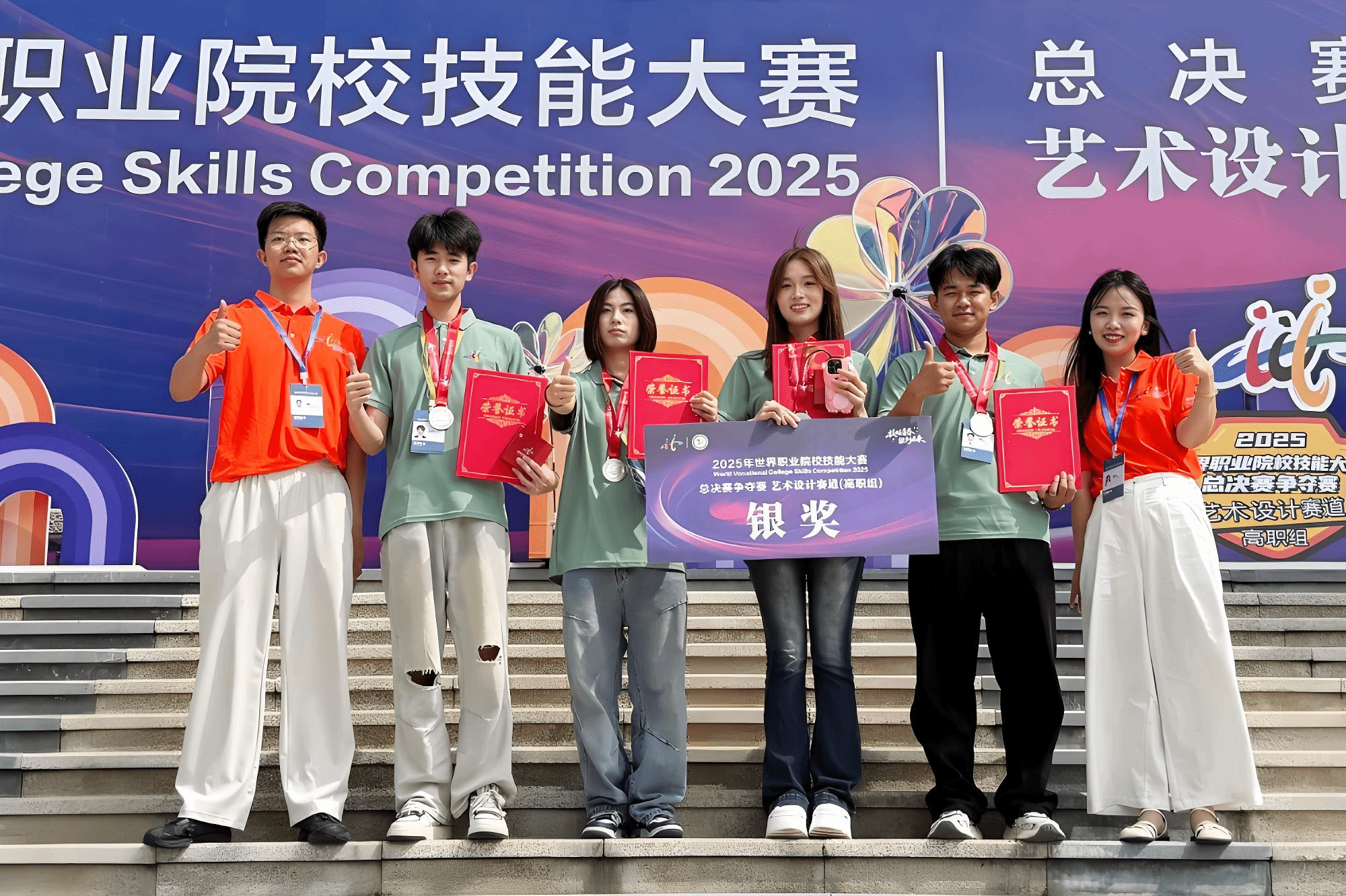 近日,2025年世界职业院校技能大赛总决赛争夺赛艺术设计赛道(高职组)在贵州电子商务职业学院落幕。从全国各省市层层突围的200支代表队同场竞技,最终艺术设计学院井雨情、周志群、卞路路、张志强四位同学在指导老师陈研然、潮宇的悉心指导下,奋勇拼搏,斩获银奖。